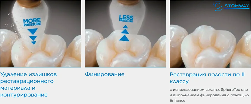 С помощью системы финишной обработки Enhance вы можете удалять излишки реставрационного материала, проводить контурирование и финирование, просто изменяя силу нажима. Нажмите сильнее для удаления излишков материала. Ослабьте давление для проведения финишной обработки. Используя систему Enhance, всего за один этап работы вы получите гладкую контурированную и естественно выглядящую поверхность. И все это только благодаря разной силе нажима. Финишная обработка и полировка за один этап работы.