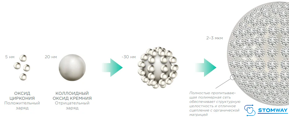 Мелкие сферические частицы оксида кремния и оксида циркония соединяются вместе и сливаются в упрочненную структуру.