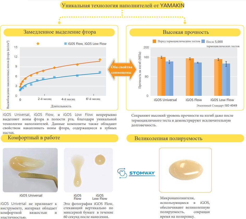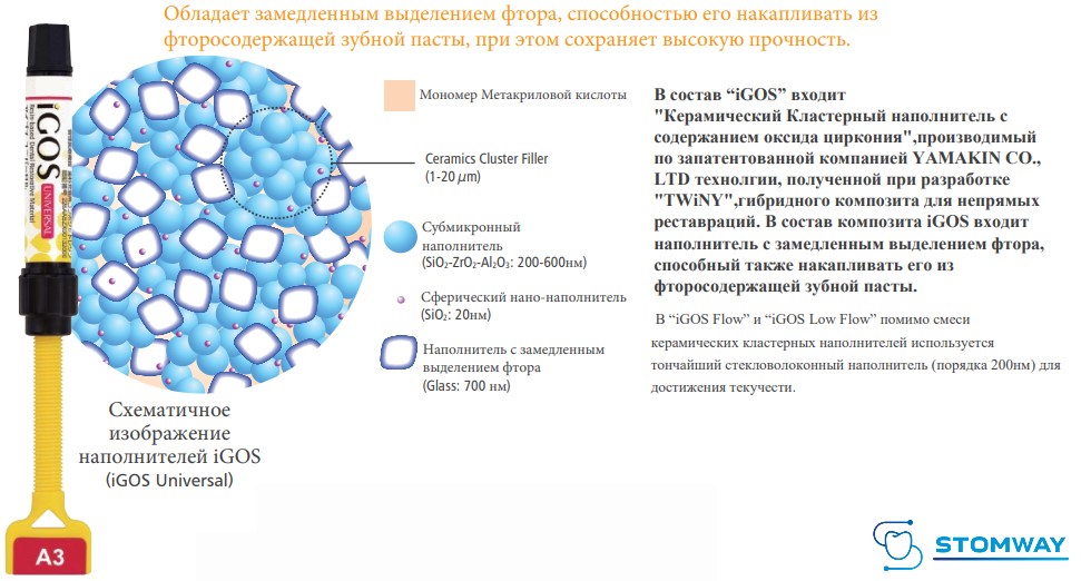 В состав iGOS входит керамо-кластерный наполнитель с содержанием диоксида циркония, производимый по запатентованной технологии YAMAKIN. Частицы с замедленным выделением фтора, способны также накапливать его из фторсодержащей зубной пасты.