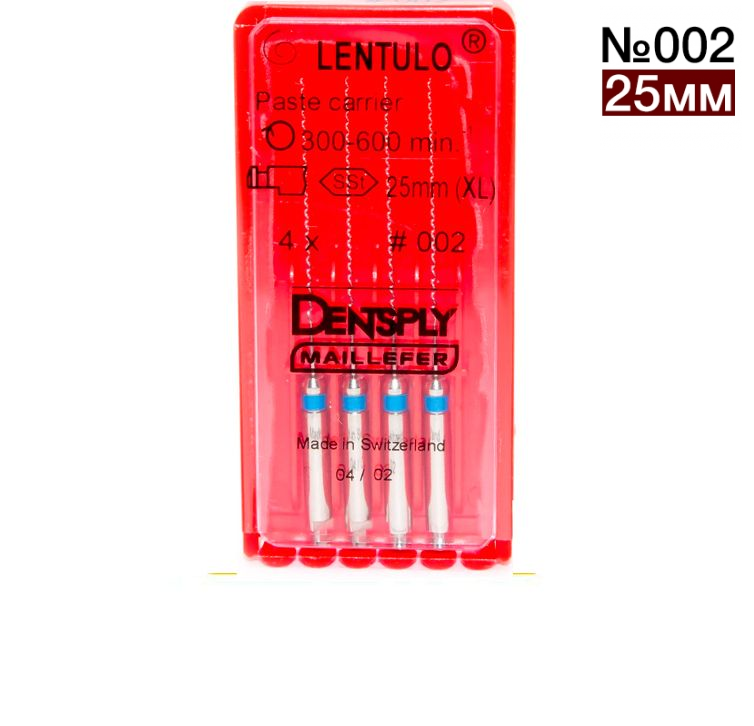 - Лентуло Dentsply Maillefer поставляются в наборах по 4 штуки, упакованных в пластиковой кассете. Инструмент нестерильный, перед использованием требуется автоклавирование.