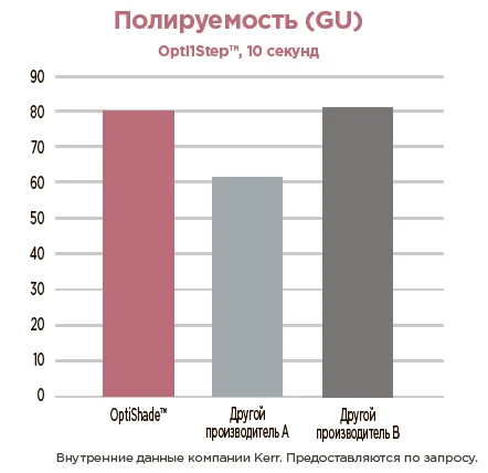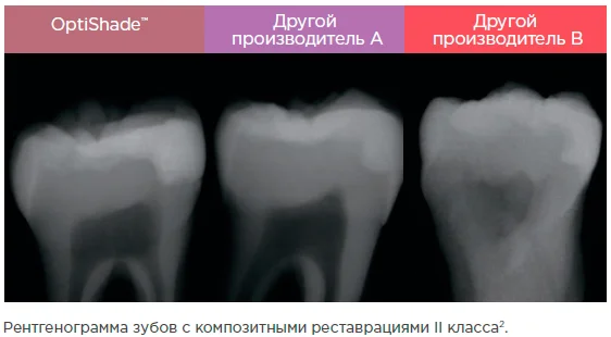 Более высокая рентгеноконтарастность позволяет четче визуализировать реставрацию на рентгенограмме. Рентгеноконтрастность OptiShade™ составляет 300% AI, что почти в два раза выше, чем у аналогичных композитов других производителей1.