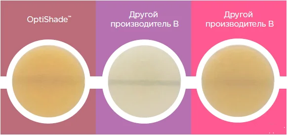 OptiShade™ обладает достаточной опаковостью для блокирования темных подлежащих тканей и прекрасно адаптируется к окружающим тканям зуба, что придает реставрации естественный вид2.