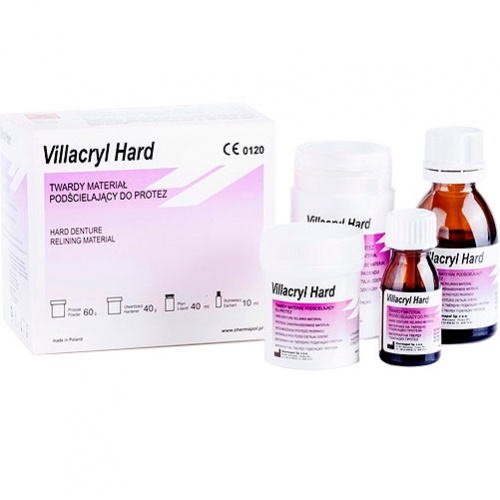 Пластмасса Villacryl Hard для временных твердых подкладок. Полиметакрилатный материал холодной полимеризации предназначен для изготовления твёрдых прокладок протезов непосредственно во рту пациента. Материал изготавливается только розового цвета. Производитель: Everall7, Польша.
